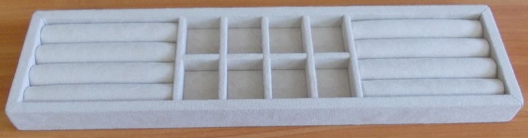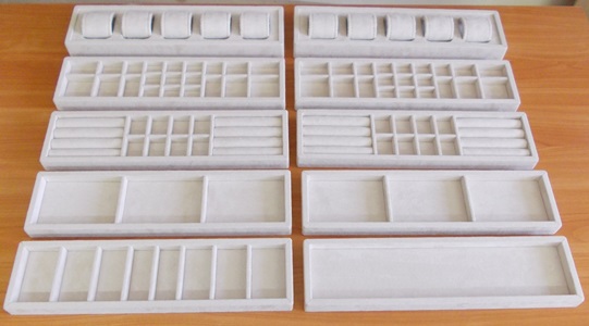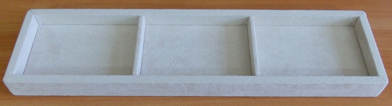 *март 2014 - г. Москва - небольшие лоточки (планшеты) в количестве 10шт для хранения ювелирных украшений на полках за стеклом очень узкого шкафа (глубина полки максимум 120мм). Материал исполнения - искусственная замша молочного цвета. Производство - компания "Вероника".
