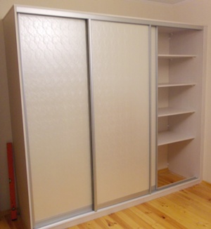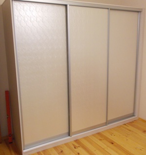*трехсекционный встроенный шкаф-купе, двери декорированы искусственной кожей коллекции Сохо, цвет белый перламутр. Производство компании "Вероника"
