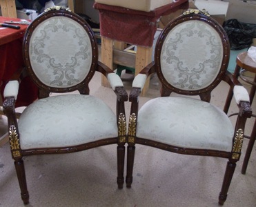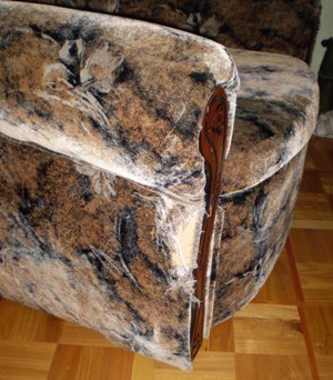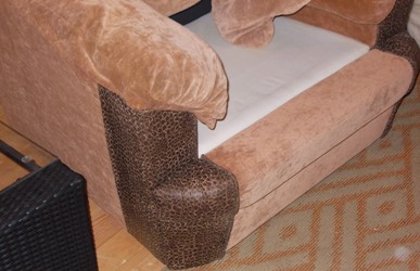 Распространенная проблема, когда какой-то незначительный элемент мебели безнадежно испорчен, Ваши деньги и время сэкономит частичная перетяжка этого элемента различными материалами, подобранными в тон или в контраст, или "родным" материалом Вашей мебели, если такое возможно.