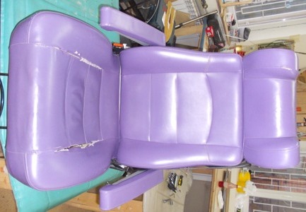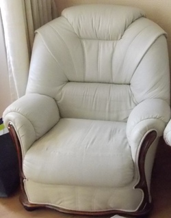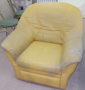 *май 2014 - сиденье, подлокотники и спинка перетянуты в искусственную кожу 5-ой категории, низ и задник оставлены "родные" в целях экономии материала.