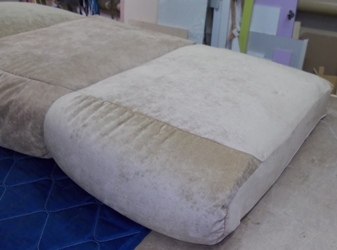 *январь 2017 - сиденье углового дивана перетянуто в велюр, максимально подобранный по текстуре и цвету к оставшейся части дивана. Продавленный пружинный блок заменен на поролон марки Эллаблок - срок службы 10 лет без изменений характеристик.