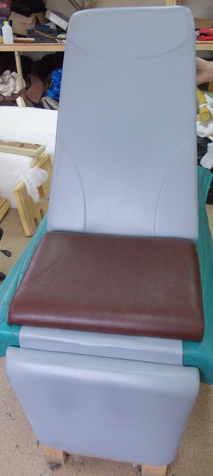 *спинка стоматологического кресла так же перетянута путем создания кроя, в тот же материл и цвет, что предыдущее кресло (заказ одной и той же стоматологии).