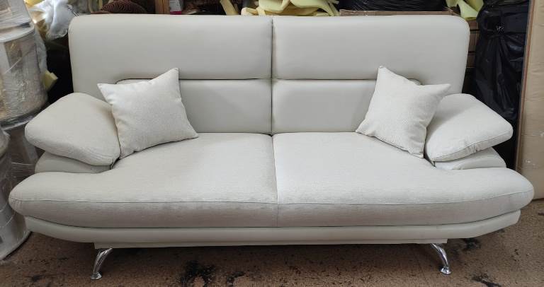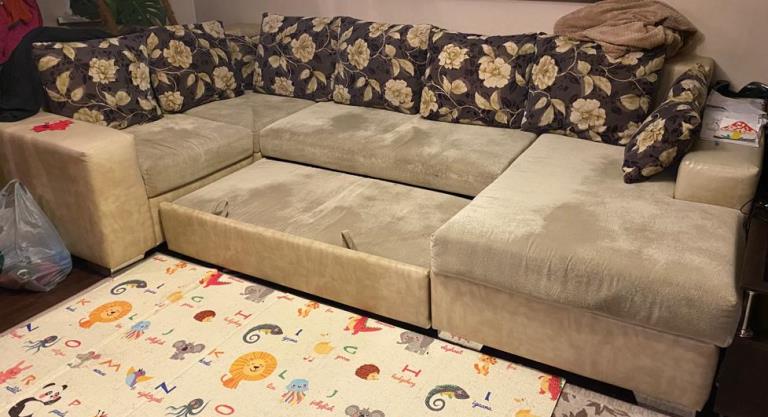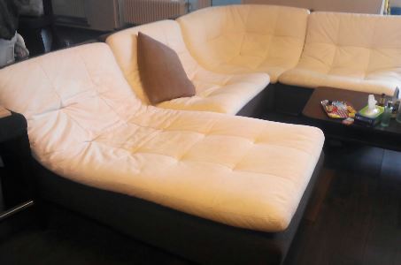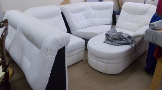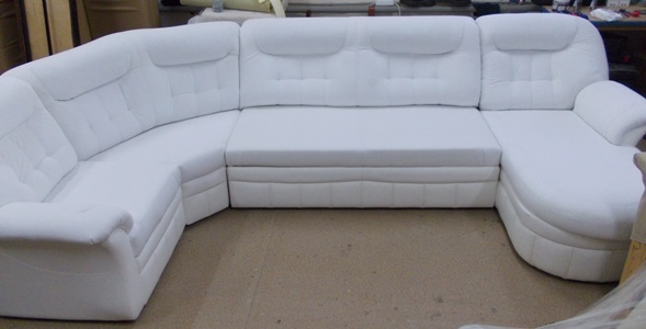 *март 2018 - угловой диван перетянут в современный велюр белоснежного цвета, полностью заменен наподнитель в сиденьях. Низ и задники остались в искусственной коже по просьбе заказчика, в целях экономии материала и удобства влажной уборки пола.