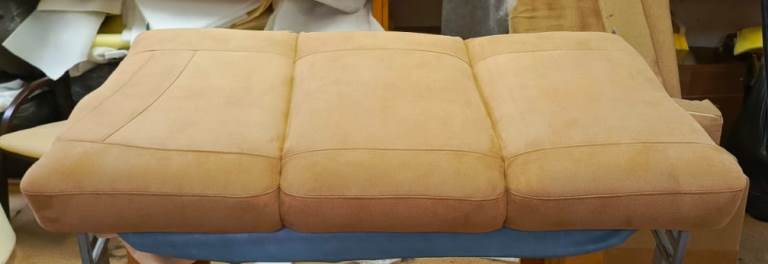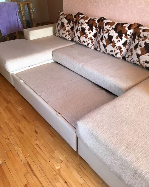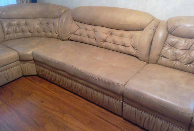 Сиденье углового дивана перетянуто в искусственную замшу, цвет идеально подобран к оставшимся частям дивана из искусственной кожи. Так же произведен ремонт основы.