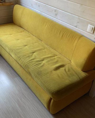 *ноябрь 2019 - сиденья дивана перетянуты в материал нового поколения - искусственную замшу с эфектом - износостойкая, благодаря особому покрытию легко чистится, на ней не остается шерсть животных. Цвет горчичный - подобран по стилю к натуральному дереву в интерьере. Так же отреставрирована часть спинки - собака выгрызла кусок наполнителя. Деталь перетянута искусственной кожей наиболее близкого цвета к оставшимся частям дивана.