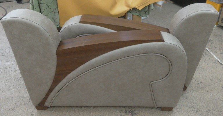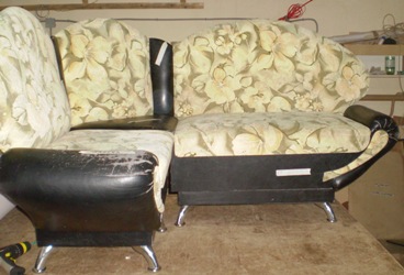 *частично перетянут во флок на флоке. В целях удешевления стоимости работ и расхода материала в прежней ткани оставлены: задник, царга и вшенняя чать подлокотников.