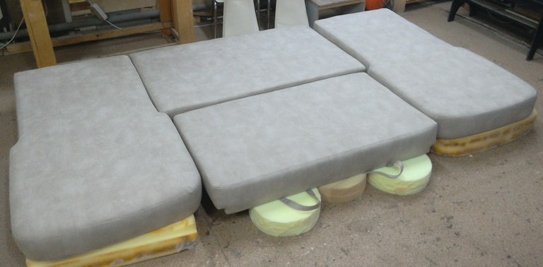 *февраль 2021 - сиденья "П"-образного дивана перетянуты в искусственную замшу с эффектом мраморности серо-бежевого цвета. Посностью заменен наполнитель на ППУ стандартной жесткости и плотности - срок службы 10 лет до первоначального невозвращения.