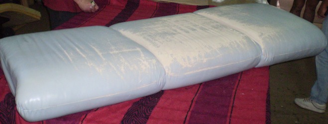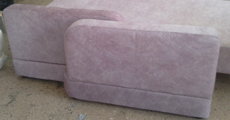 *май 2014 - неудачно подобранную ткань на сидушках и спальном месте дивана (остаются разводы даже от обычной воды) заменили на флок на флоке. Данный материал идеально подходит для тех, у кого есть дети и домашние животные. Ткань легко чистится, а расцветка и текстура скрывает даже самые значительные пятна.