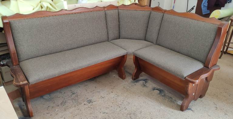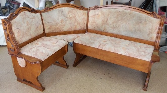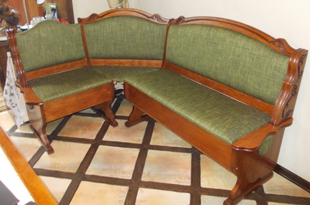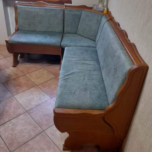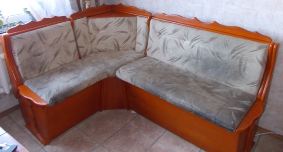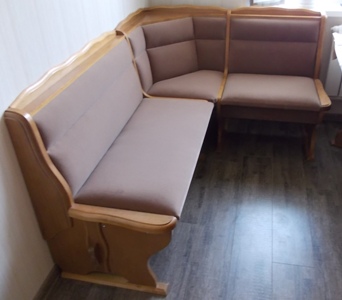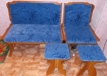 *январь 2019 - кухонный уголок перетянут в современную рогожку крупного сечения, полностью заменен наполнитель в спинках и сиденьях, наиболее поврежденный деревянные части отреставрированы.
