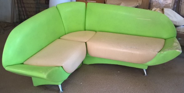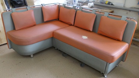 *январь 2019 - перетянут в две различные коллекции искусственной кожи. Светлый - искусственная кожа 5-ой категории, рыжий - искусственная кожа премиум класса, в составе присутствует натуральная кожа, что обеспечивает наибольшую долговечность использования. Такое сочетание сделано не случайно - более износостойкая - на наиболее используемые части кухонного уголка, а на менее используемые - искусственная кожа по более низкой цене. Это существенно снизило стоимость перетяжки.