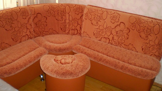 *август 2010 - кухонный уголок и пуфик частично (спинка и сиденья) перетянуты во флок на флоке разных текстур.