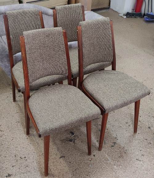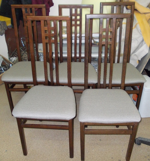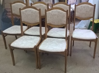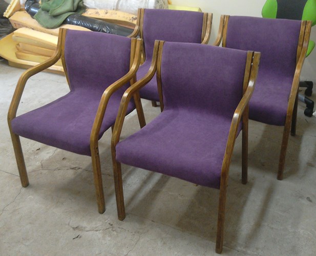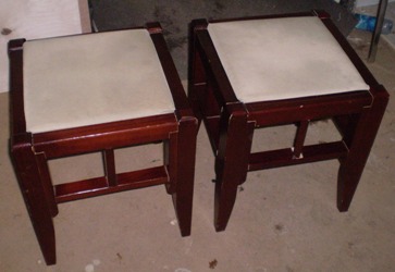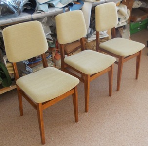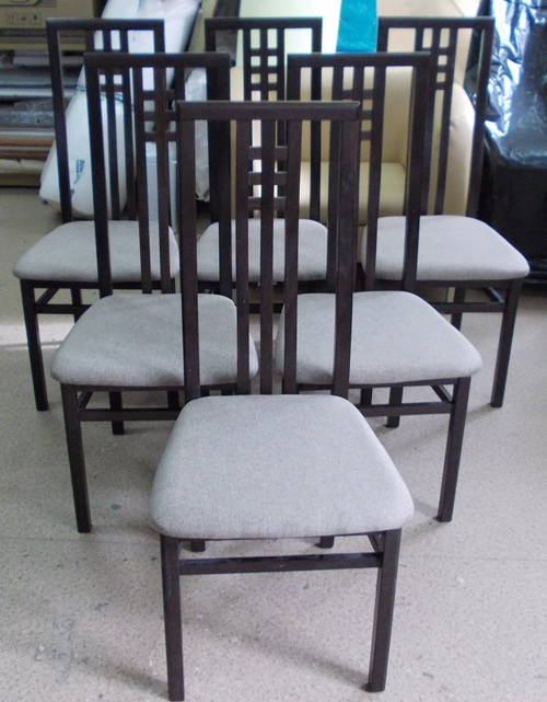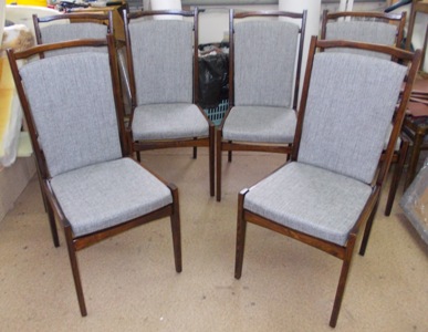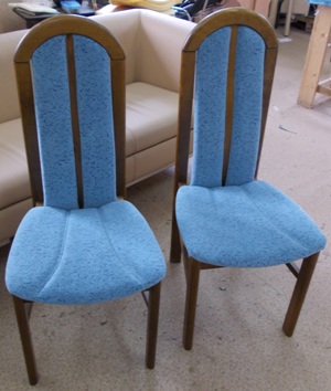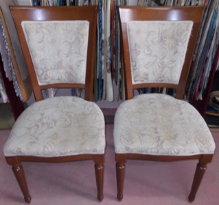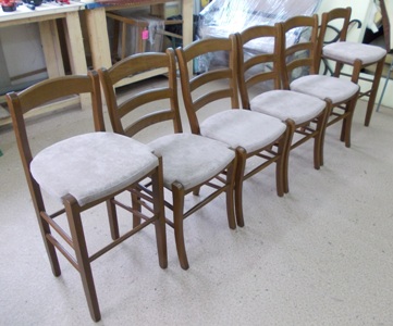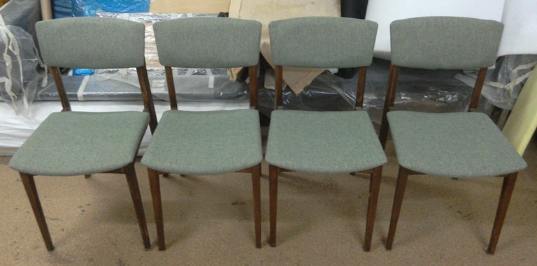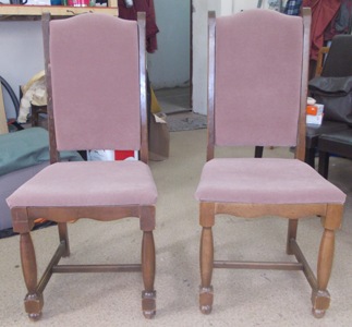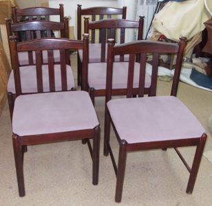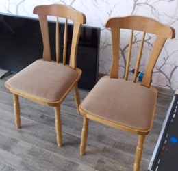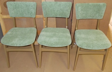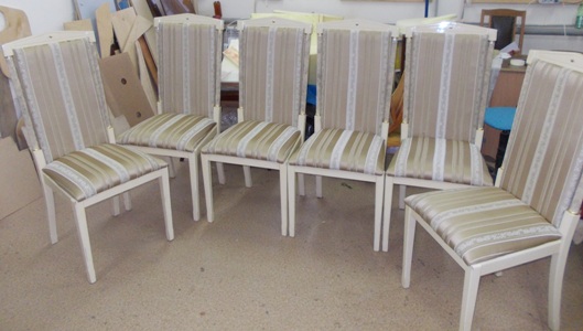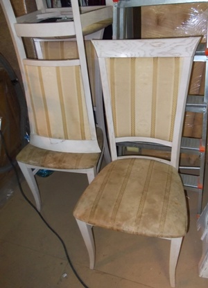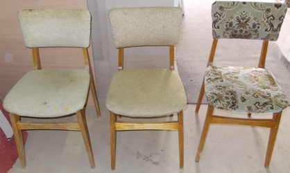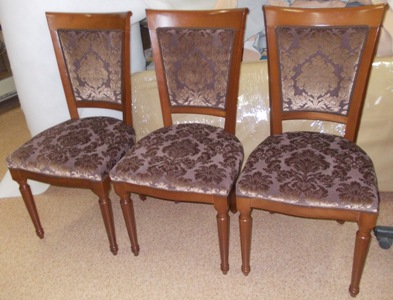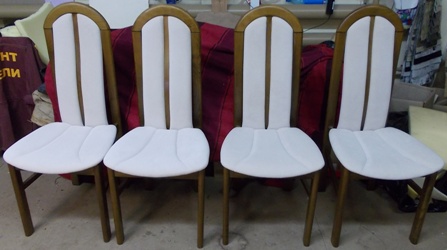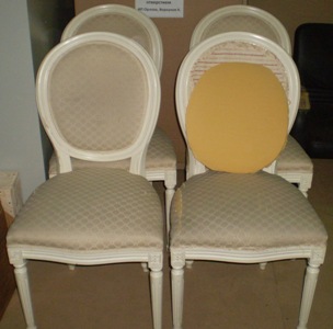 *№1 - перетянут в искусственную замшу, №2 - косметически отреставрированы, перетянуты в рогожку серебристого цвета, №3 - полностью отреставрирован, цвет покрытия деревянных частей - палисандр, сиденье перетянуто в жаккард. У всех стульев заменен наполнитель на сиденьях на ППУ стандартной жесткости.