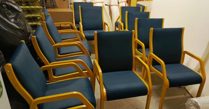 *апрель 2025 - стулья ИКЕЯ для концеренц-зала перетянуты в современный велюр глубокого синего цвета.