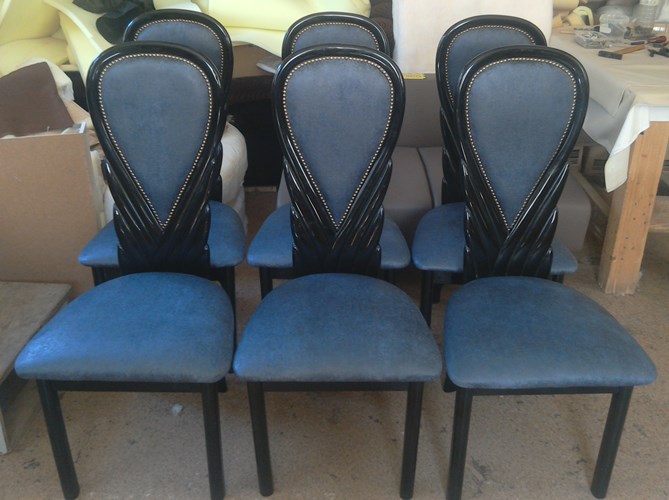 *июнь 2021 - стулья, обтянутые изначально кожзамом низшей категории, который потрескался и начал обсыпаться, перетянуты в велюр класса "Премиум" темно-синего цвета. Спинка декорирована молдингом, цвет "Состаренное золото".