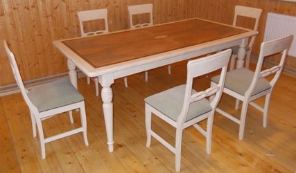*стол и 6 стульев отреставрированы и окрашены с применением технологии "двухцветие" (основной цвет слоновая кость, вкрапления цвета натурального дерева). Столешница отреставрирована и покрыта бесцветным лаком, чтобы сохранить красоту натурального дерева ясень. Сиденья стульев перетянуты во флок IQ и декорированы гвоздями.