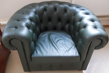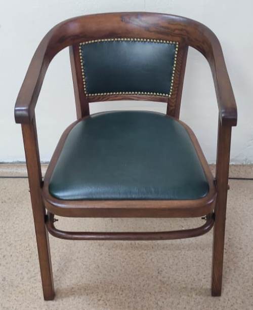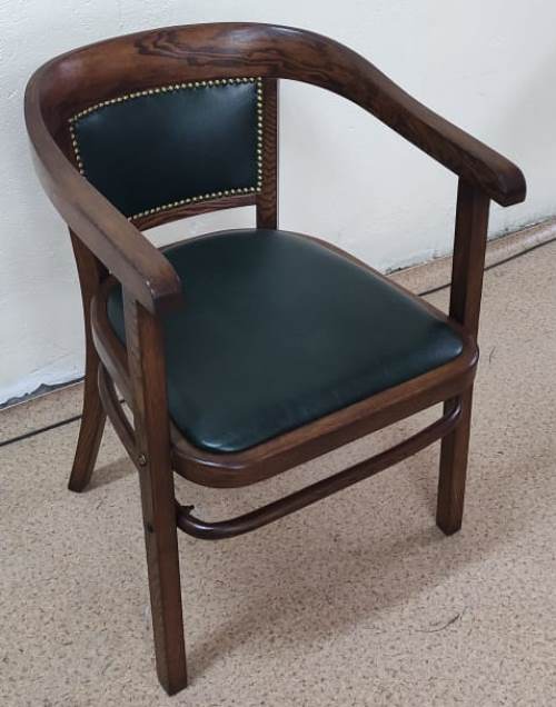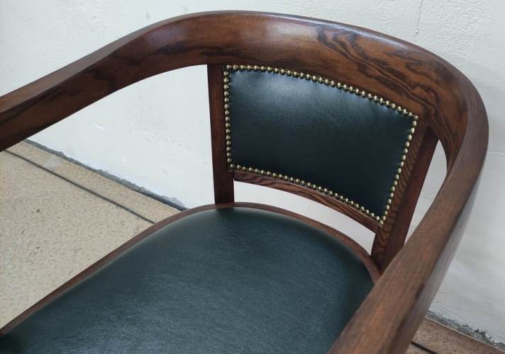 *январь 2024 - полукресло отреставрировано - полностью снято старое покрытие, тонировано в цвет "Венге", финишный слой - полуматовый паркетный лак - наиболее стойкий к ударам и повреждениям. Заменен наполнитель, перетянуто в антивандальную искусственную кожу Фантом глубокого зеленого (кабинетного) цвета, спинка оббита с молдингом "Старое золото".