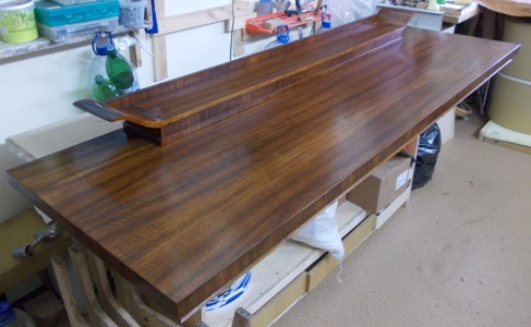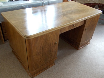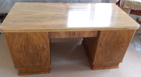 *стол собран из деталей, отреставрирован,.Нанесено новое лаковое покрытие с высоким глянцем, восстановлены недостающие внутренние части ящиков и тумб