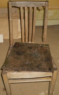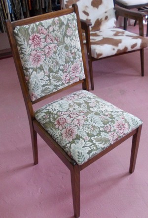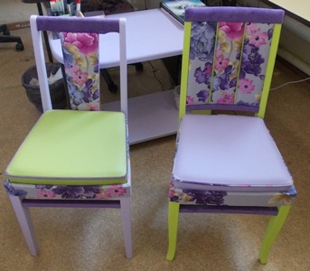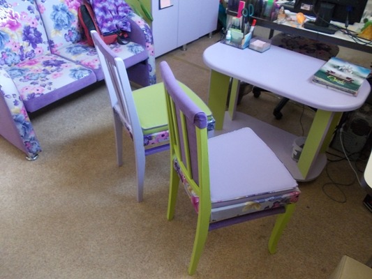 *стулья советских времен, казалось бы, уже абсолютно потерянные, как предметы мебели, были востановлены и отреставрированны в современном стиле - деревянные части окрашены в цвет имеющейся мебели в помещении, а мягкие части - декорированы различными тканями - искусственной кожей, замшей, велюром, так же, под стиль интерьера. Стулья стали отличным нестандартным дополнением композиции.