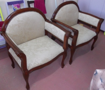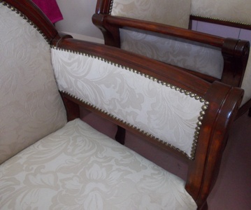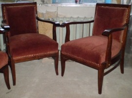 *кресла перетянуты в современный велюр с использованием молдинга и декоративных гвоздей, полностью заменен наполнитель на ППУ стандартной жесткости, который служит 10 лет до первоначального невозвращения. Деревянные части кресел отреставрированы и приобрели новый цвет.