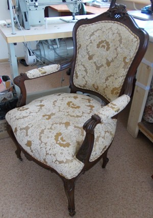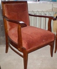 *кресло перетянуто с декорированием молдингом, деревянные части отреставрированы, лак Белинка, цвет "Полисандр". Мягкие элементы заменены частично.
