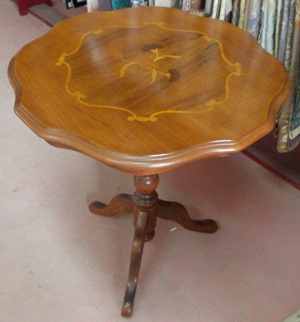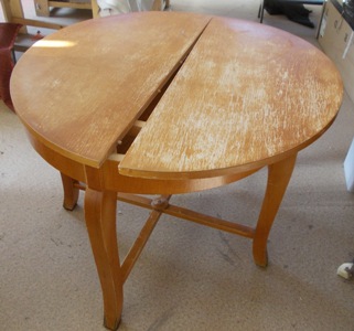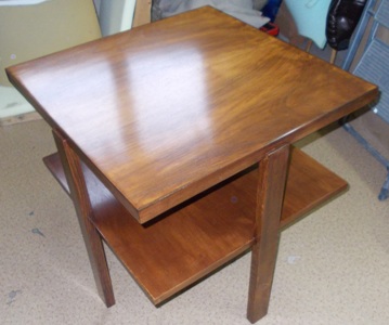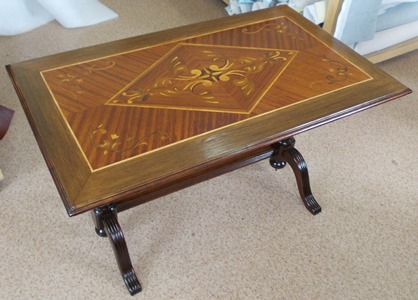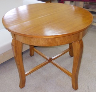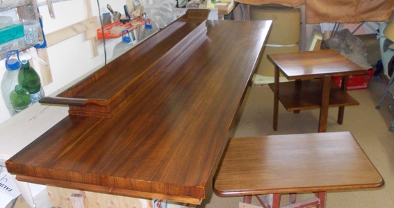 *№1 - у журнального столика по краям шпон заменен на новый, дубовый, инхрустация по центру восстановлена, лакировка - Белинка полуматовая, №2 - элементы повреждены не были, поэтому была возможна косметическая реставрация, без снятия покрытия до "0". Покрыт новым слоем полуматового лака.