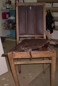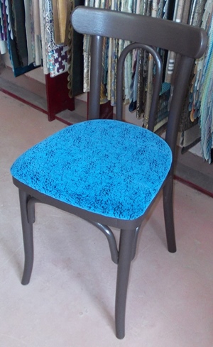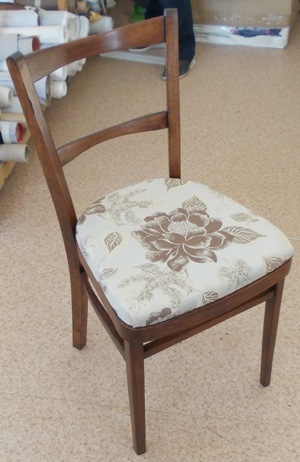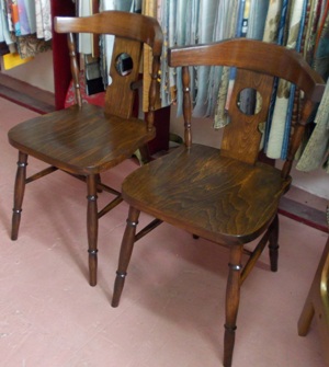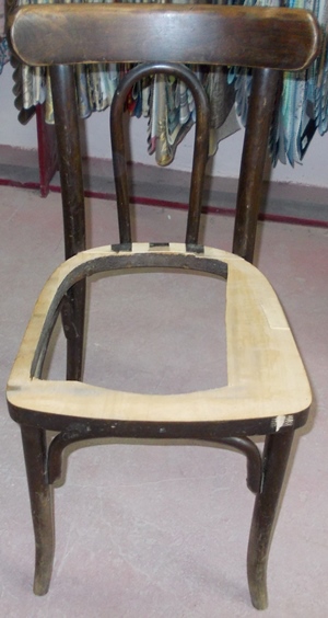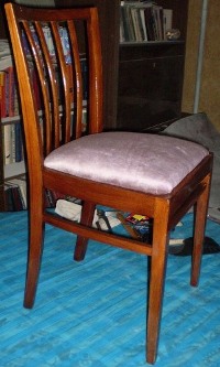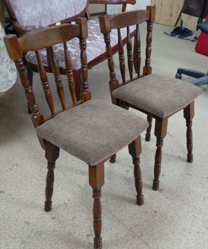 *"Венский" стул окрашен водоэмульсионной краской с колером "Венге", сделано новое сиденье, обтянутое флоком на флоке. Другой стул - лакировка "Белинка" цвет "Орех" и полуматовый лак, сиденье перетянуто в жаккард.