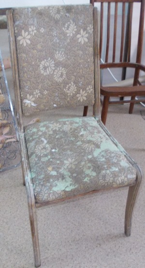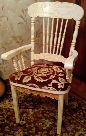 *малазийский стул, у которого отсутствовало основание, собран по частям. Основа взята от другого стула. Покрашен с использованием техники "двухцветие" (белый и золото). Декорирован фигурными накладками из шпона. Сделано новое мягкое сиденье из шинилла 7-ой категории.