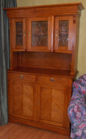 *буфет полностью отреставрирован. Сильно поврежденные элементы шпонированы буком. Цвет покрытия - Орех полуматовый, Белинка.