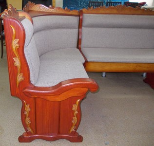 *кухонный уголок перетянут в современную рогожку крупного сечения, полностью заменен наполнитель в спинках и сиденьях, наиболее поврежденный деревянные части отреставрированы - цвет подобран наиболее влизкий к ярким вкраплениям основного изначального цевета. Резные элементы оставлены прежними - на них повреждений не было. В результате, получился яркий контраст, и кухонный уголок обрел новую жизнь.