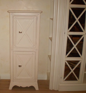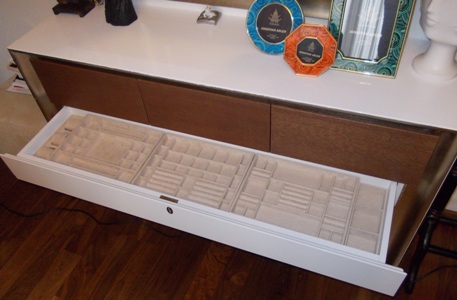 Ящик комода оборудован ячейками для хранения ювелирных украшений. Сверху ячеек размещаются три съемных мобильных лотка, которые могут меняться местами и храниться в других ящиках. Материал отделки - искусственная замша. Раздел "Оборудование комодов, тумб, шкафов для хранения ювелирных украшений"